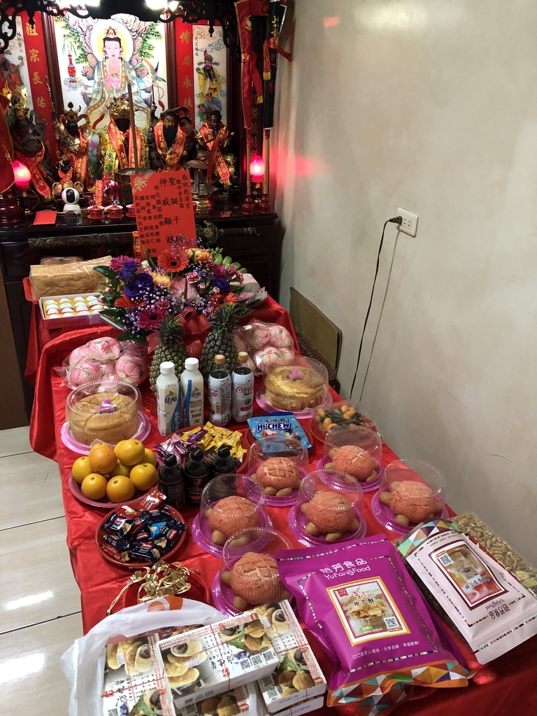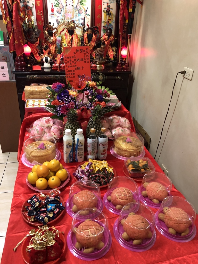 謹虔具 鮮花素果,壽桃糕餅, 誠心誠意,