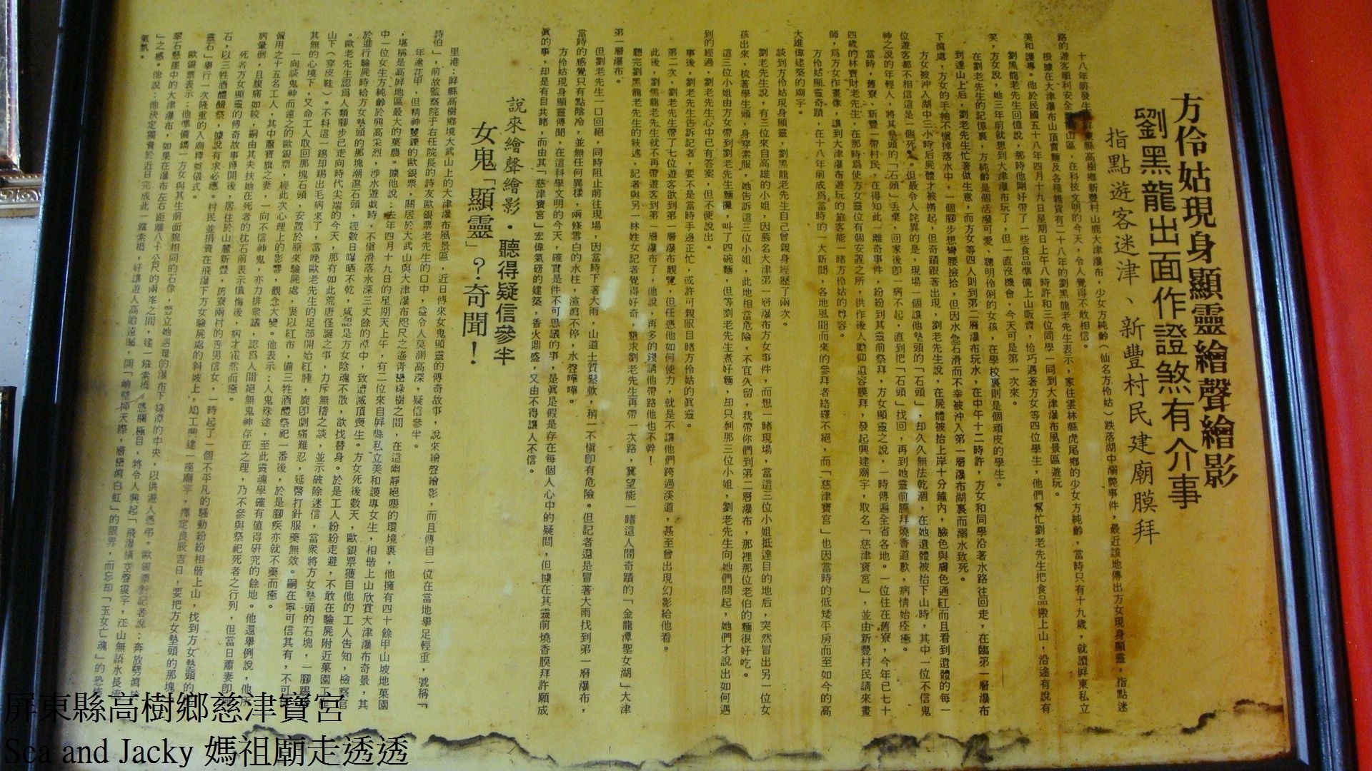 屏縣高樹鄉境內的大津瀑布風景區傳來方女顯靈的傳奇故事,
